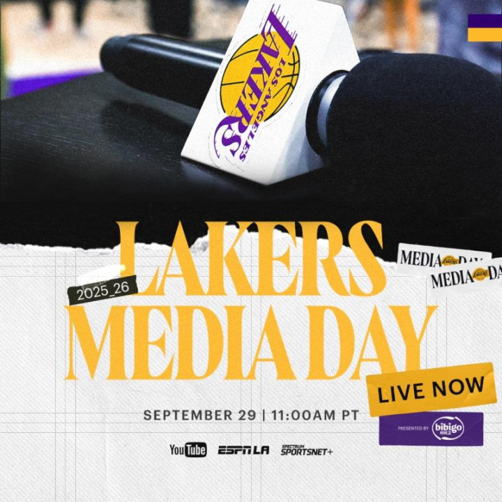 湖人官方账号发推特报道,正在直播:湖人2025-26赛季媒体日。:LakersYouTube,@SpectrumSN,ESPNLA#LakersMediaDayx@bibigoUSA