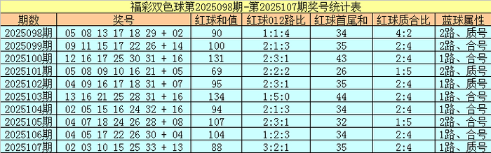 福彩双色球第2025107期红球奖号为:02、03、10、15、25、33,蓝球奖号为:13,其中红球和值为88,012路比为3:2:1,首尾和为35,质合比为2:4,蓝球属性为1路、质号。