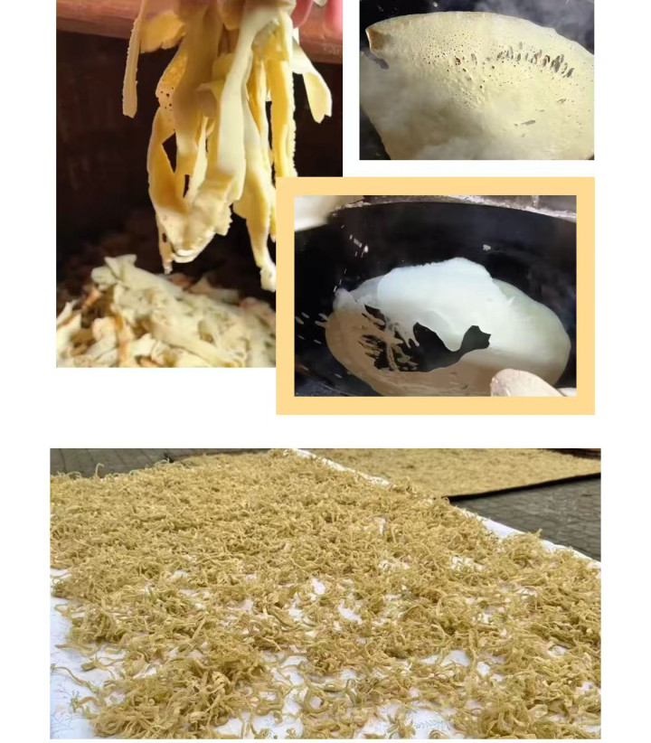 刚出锅的绿豆粉皮清香柔韧,裹上白糖就可以直接享受美味,还能切成细条,晒干后与农家腊肉一同烩制;红薯粉则Q弹有嚼劲,无论是煮着吃还是放进火锅里,都是地道的农家风味。难得看到村民制作粉皮的过程更是一种乐趣,看粉浆在锅中慢慢凝固,听柴火噼啪作响,满满的都是治愈人心的烟火气。