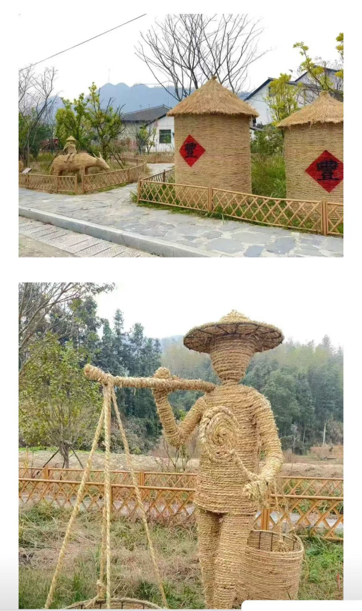 踏入景区,仿佛闯进了童趣满满的秋冬童话。田间地头、广场角落,一个个憨态可掬的稻草人悄然伫立,有的戴着草帽坐在谷仓旁,有的则是小熊和兔子形象,造型各异、栩栩如生。一旁的复古谷仓更是氛围感拉满,装满金黄稻谷的木仓透着质朴的年代感,随手一拍都是自带滤镜的大片,不管是大人还是小孩,都忍不住停下脚步打卡合影。
