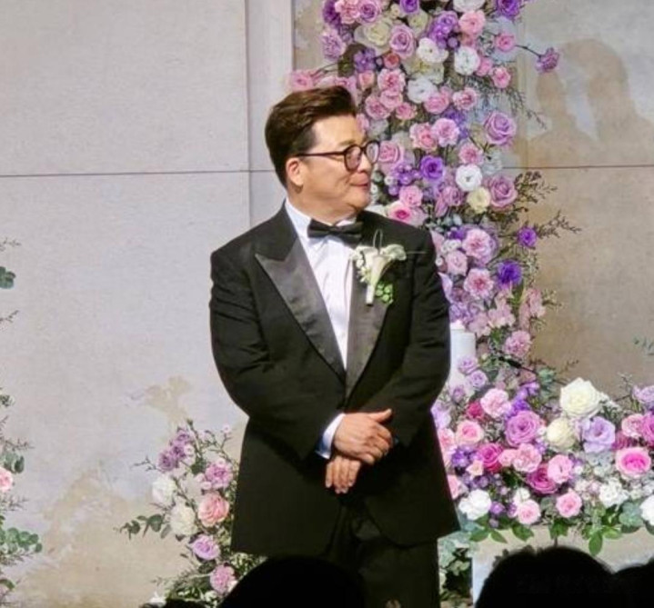 婚礼上,刘在石一直保持绅士般的微笑,看到新娘进场时还轻轻点头致意,送上国民主持人的祝福。