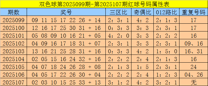红球三区比:上期红球三区比为3:1:2,红球最近9期三区号码个数比为17:20:17,本期重防红二区号码热出,看好三区比为1:4:1。